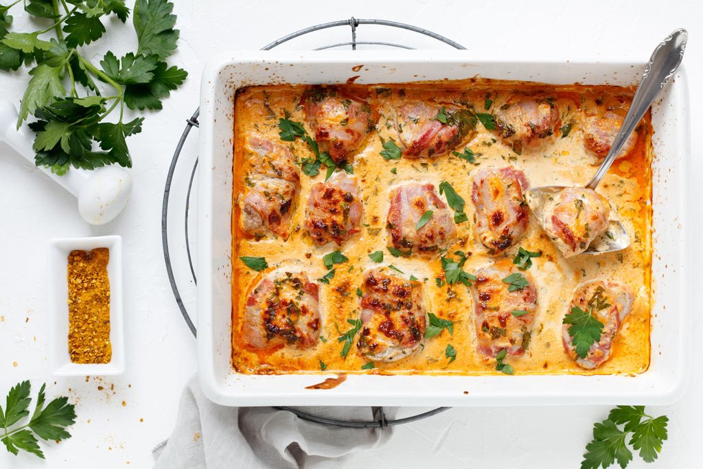 An Feiertagen und Familienfesten soll etwas Besonderes auf den Tisch, das aber möglichst wenig Arbeit macht. Das Schweinefilet im Speckmantel mit Currysahnesauce aus dem Foodblog „emmikochteinfach.de“ der Kölner Foodbloggerin Christiane Emmi Prolic ist ein alltagstaugliches und unkompliziertes Rezept, das man auch für viele Personen ohne großen Aufwand in nur 35 Minuten auf den Tisch bringen kann. Es lässt sich zudem sehr gut vorbereiten, durch die Zubereitung im Ofen ohne vorheriges Anbraten geht auch der Abwasch schnell vonstatten.