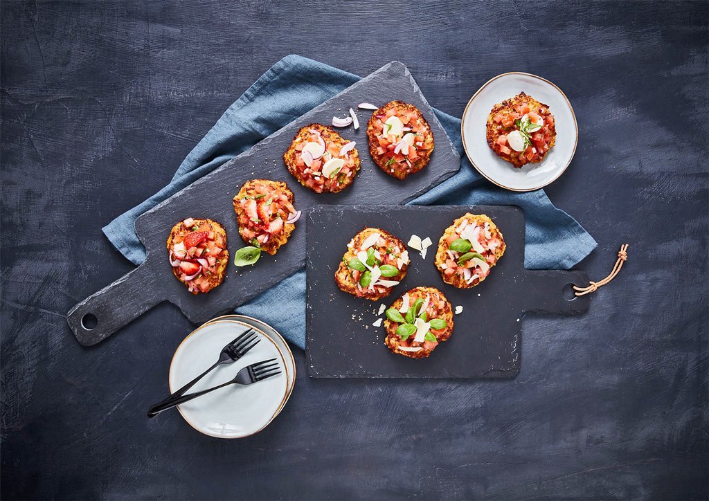 Für das Gartenfest: Bruschetta aus Mini-Reibekuchen