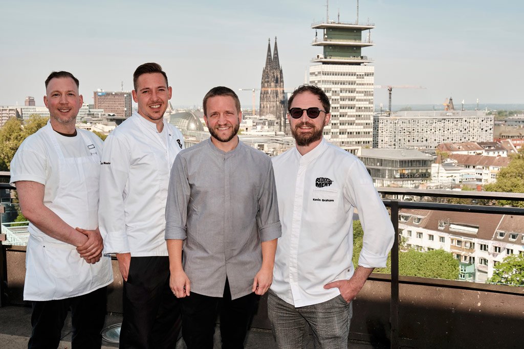 Henrik „Henne“ Olfen – heute Gastgeber der gefeierten Henne.Weinbar – war einst Sous-Chef im La Vision im Wasserturm Hotel. Am 30. August kehrt er zurück, mit seiner Handschrift aus moderner Bistroküche und großer Weinliebe. Mathias Maucher führte das „Himmel un Äd“ im Wasserturm Hotel 2014 zum Michelin-Stern. Bei der Kitchenparty steht er wieder am Herd – fokussiert, präzise und voller Geschmack. Eric Werner – jüngster 2-Sterne-Koch seiner Zeit ist heute Küchenchef im „Augustin“. Auch er ist eng verbunden mit dem Wasserturm Hotel. Als Nachfolger Mauchers im „Himmel un Äd“ prägte er dessen zweite Ära. Last but not least Kevin Graham, der die Eröffnung als Curio Collection als Küchenchef verantwortete.