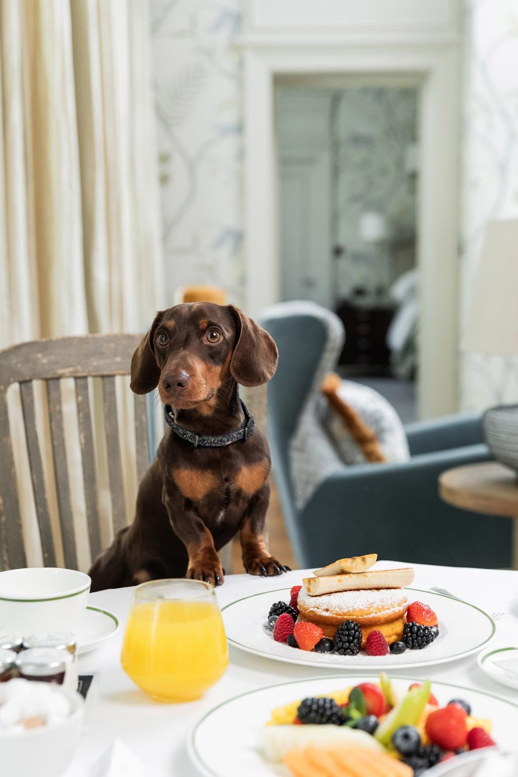 In einem tollen Kosmetiktäschchen mit einer Handcreme, Pfoten- und Schnauzenbalsam, sowie anderen tollen Essentials von William Morris At Home, sind die Kleinen bestens für eine ausgiebige Entdeckungstour durch die Nachbarschaft gerüstet. Zurück im Hotel können die Hündchen anschließend gemeinsam mit ihrem Herrchen im Charlie’s oder im Drawing Room Mittagessen.