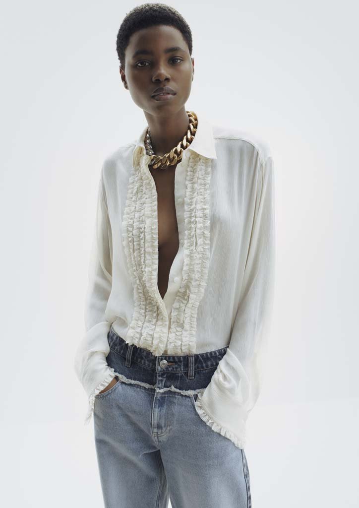 Die Kollektion vereint Vergangenheit und Gegenwart und kombiniert beliebte aktuelle Signaturen wie übergroße Hemden, weitläufige Gräben und scharfe Schneiderarbeiten mit verspielten ikonischen Hits aus McCartneys frühem Archiv, darunter Schmuckdrucke und Slogan-Tops.