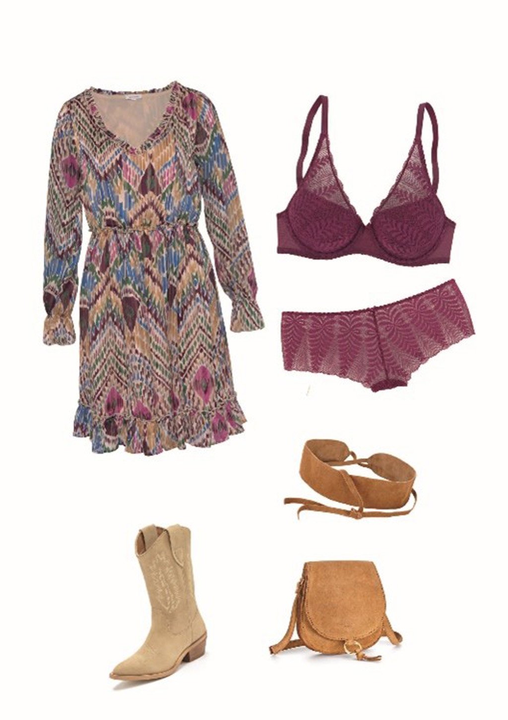 Wer sagt, dass farbenfrohe Prints nur im Sommer getragen werden? Das Chiffonkleid mit Ethnoprint von Lascana (Größe 34–46, ab 69,99 Euro) ist ein richtiger Hingucker und bringt echtes Bohemian-Feeling in den Herbst. Für drunter eignet sich der Amira-Schalen-BH (Größe 70B–95F, ab 49,99 Euro) mit passender Panty (Größe 36/38–48/50, ab 19,99 Euro) in Weinrot perfekt.