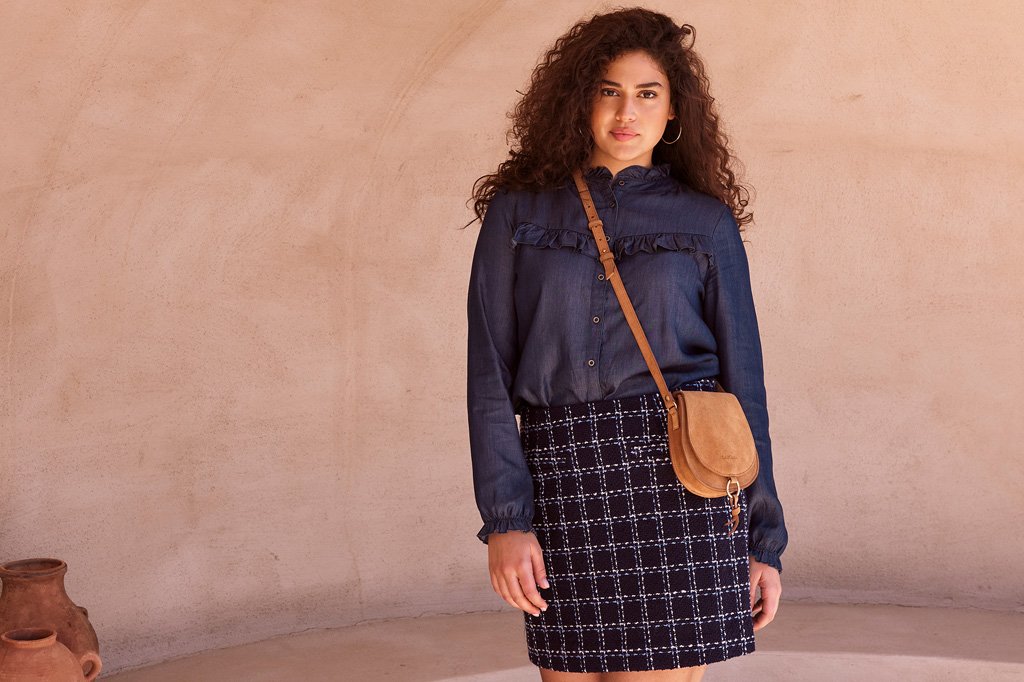 Der elegante Tweedstoff Bouclé ist heute angesagter denn je. Ein echter Klassiker der französischen Haute Couture ist die kurze Kastenjacke, die für den Alltag optimal ist. Die Boucléjacke (Größe 34–46, ab 89,99 Euro) in weiß-dunkelblauem Karomuster über einem schlichten Rollkragenpullover aus Feinstrick (Größe 32/34–44/46, ab 39,99 Euro) getragen, trifft genau diesen zeitlosen Stil.