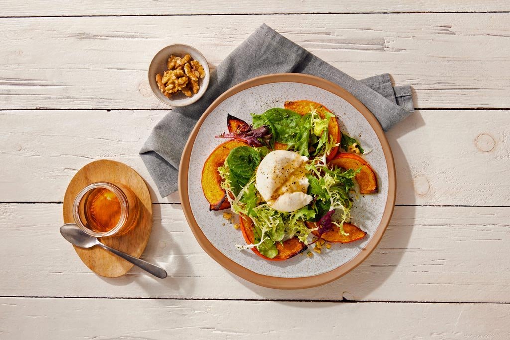 Rezept: Babyleaf-Salat mit Ahorndressing, Burrata und Nüssen auf Hokkaidospalten