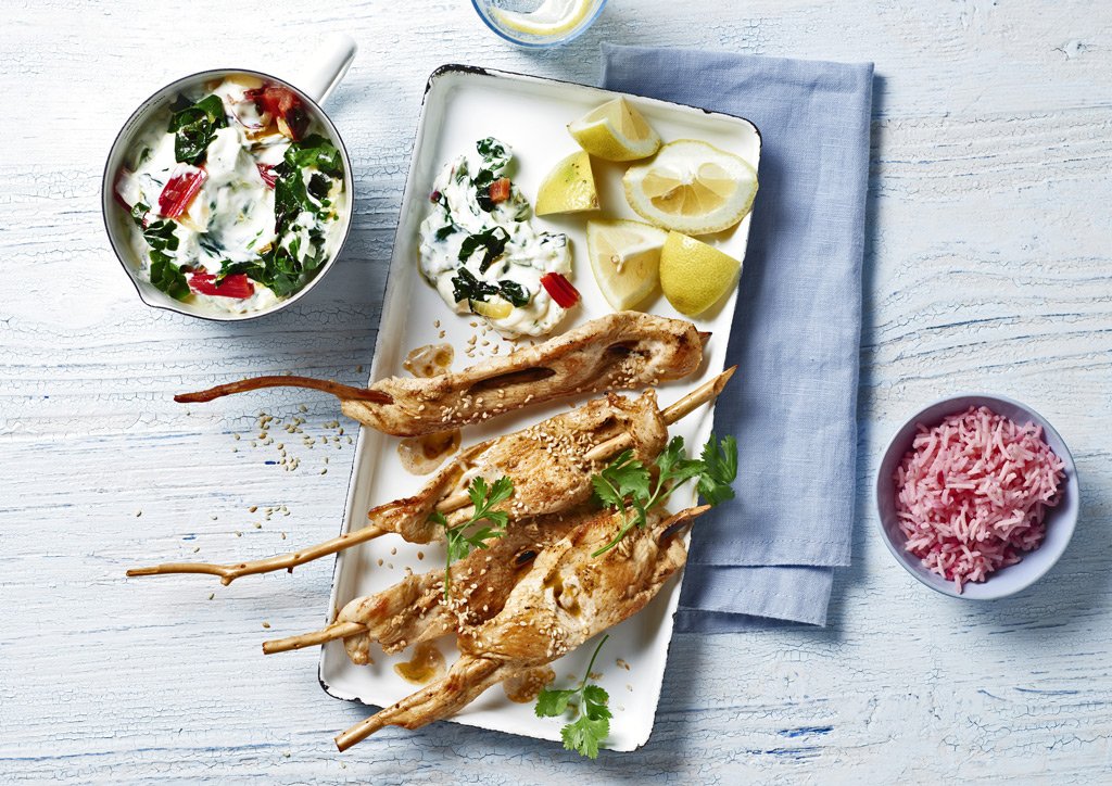 - 100 g Weihenstephan Skyr mit Tandooripulver mischen. Ingwer schälen, fein hacken und unter den Skyr rühren. Hähnchenbrustfilets in 1 cm dicke Streifen schneiden, in einer flachen Schüssel mit dem Skyr mischen, zudecken und mindestens 6 Stunden im Kühlschrank marinieren lassen. Danach die Streifen aus der Marinade nehmen und auf Holzspieße fädeln.