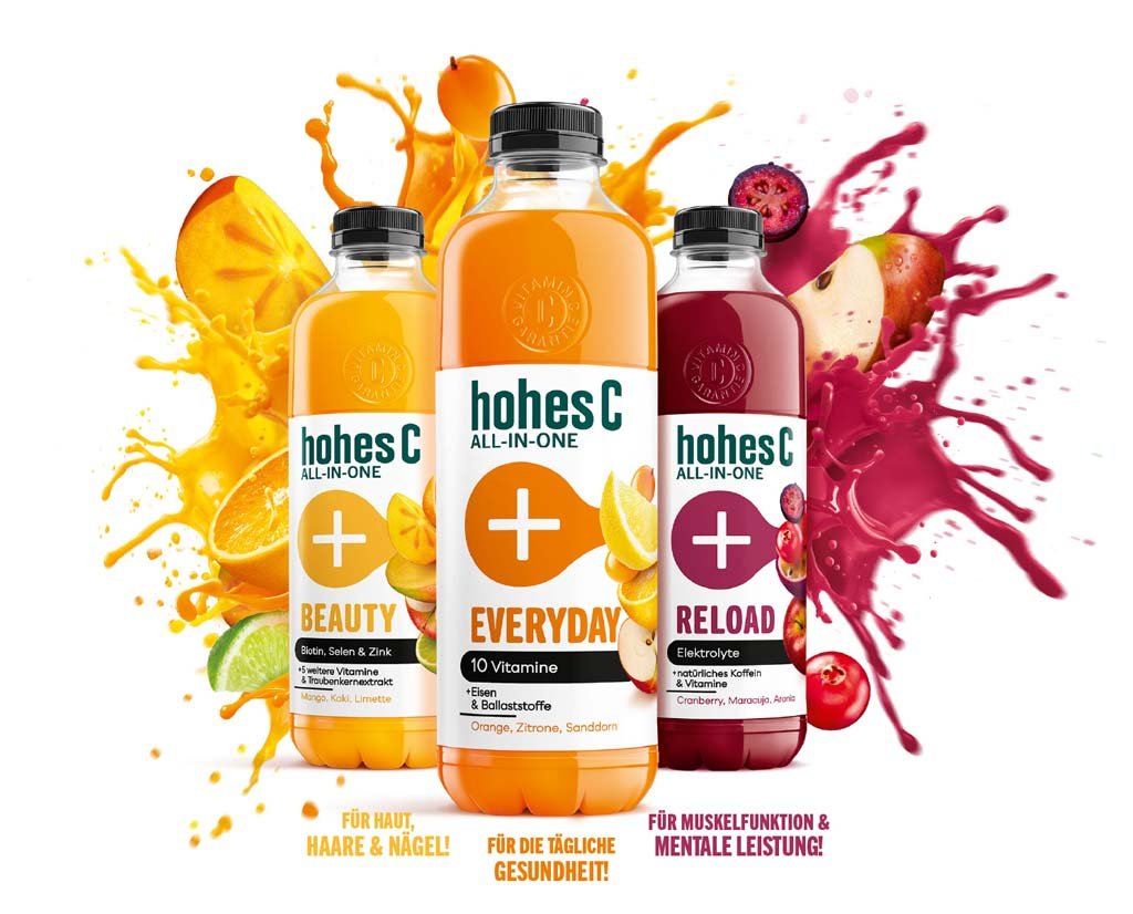 Für zusätzliche Unterstützung sorgen die neuen ALL-IN-ONE Produkte von hohes C in den drei verschiedenen Sorten EVERYDAY, RELOAD und BEAUTY. Sie decken unterschiedliche Bedürfnisse ab und sind natürlich ohne Zuckerzusatz und Süßungsmittel. Die drei Begleiter von hohes C enthalten viele relevante Vitamine, teilweise Mineralien und leckere Fruchtsäfte.