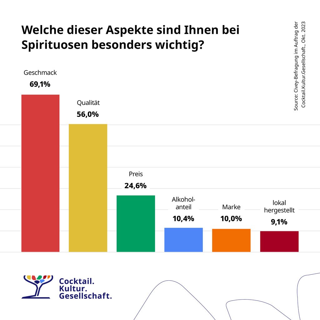 Die Cocktail.Kultur.Gesellschaft. steht nicht nur für die große Kreativität und Qualität der Branche, sondern auch für einen bewussten und verantwortungsvollen Genuss. Nun veröffentlichte Ergebnisse einer Studie der Cocktail.Kultur.Gesellschaft. zum Thema "Cocktailkultur in Deutschland" zeigen: Bei den Konsument*innen ist seit einigen Jahren eine Veränderung der Konsumgewohnheiten zu beobachten. Der Trend geht klar zu ausgewählten und qualitativ hochwertigen Cocktails, denn Geschmack (69,1%) und Qualität (56,0%) führen die Entscheidungskriterien bei der Auswahl von Cocktails deutlich an.