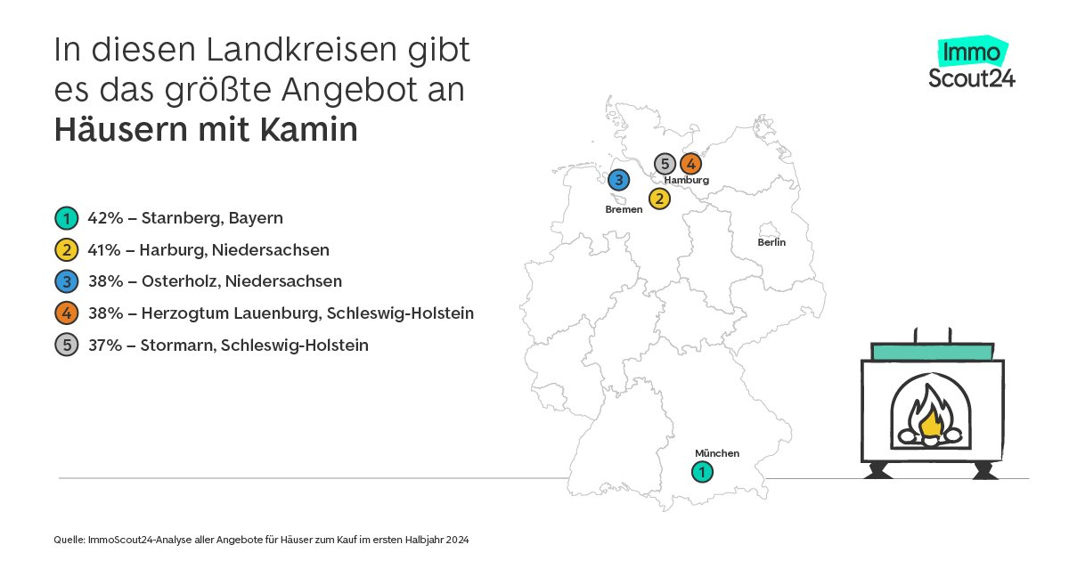 Die Gemeinde mit den meisten Kaminen ist das oberbayrische Starnberg. 42 Prozent der zum Kauf angebotenen Häuser haben einen Kamin. Besonders viel Angebot gibt es auch in den Hamburger Umlandkreisen Harburg (41 Prozent), Herzogtum Lauenburg (38 Prozent) und Stormarn (37 Prozent). Auch im Landkreis Osterholz, nördlich von Bremen, ist mehr als jedes dritte Haus mit einer Feuerstelle ausgestattet (37 Prozent).