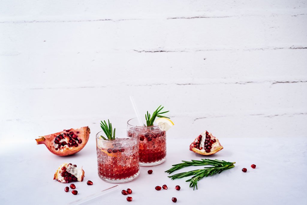 - Anschließend die Cocktailgläser mit Eiswürfeln und Granatapfelkernen befüllen, Rosmarin leicht zwischen den Händen reiben und dazu geben.