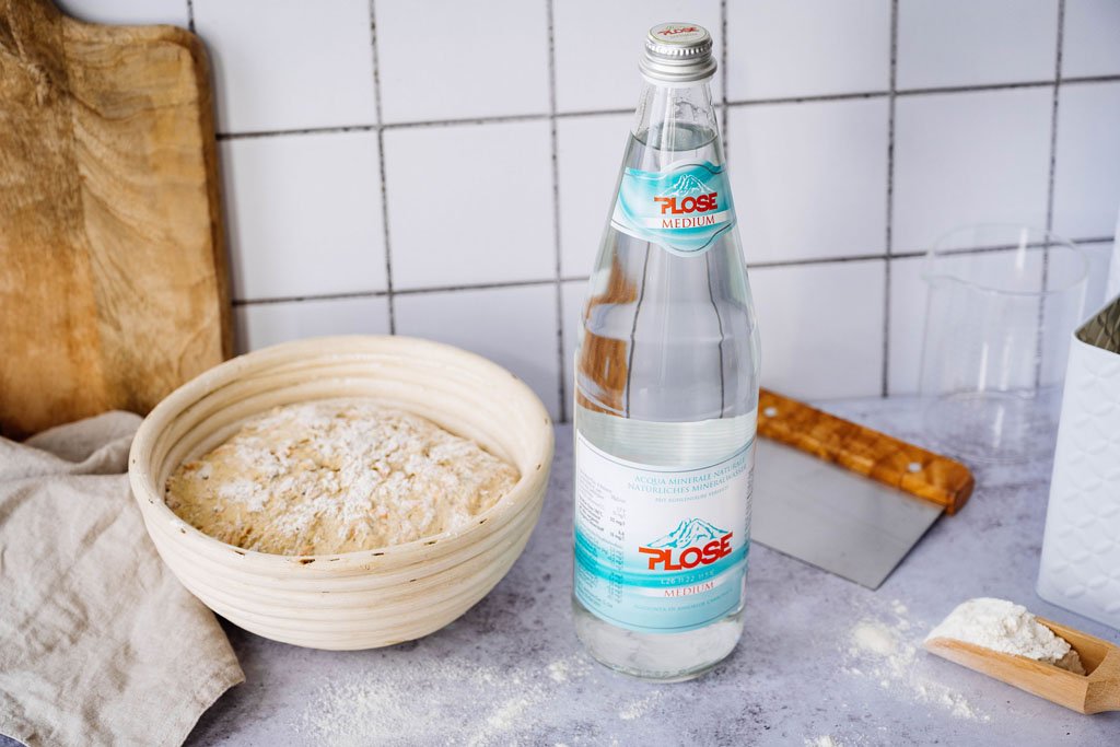Selbstgebackenes Brot mit Mineralwasser Medium